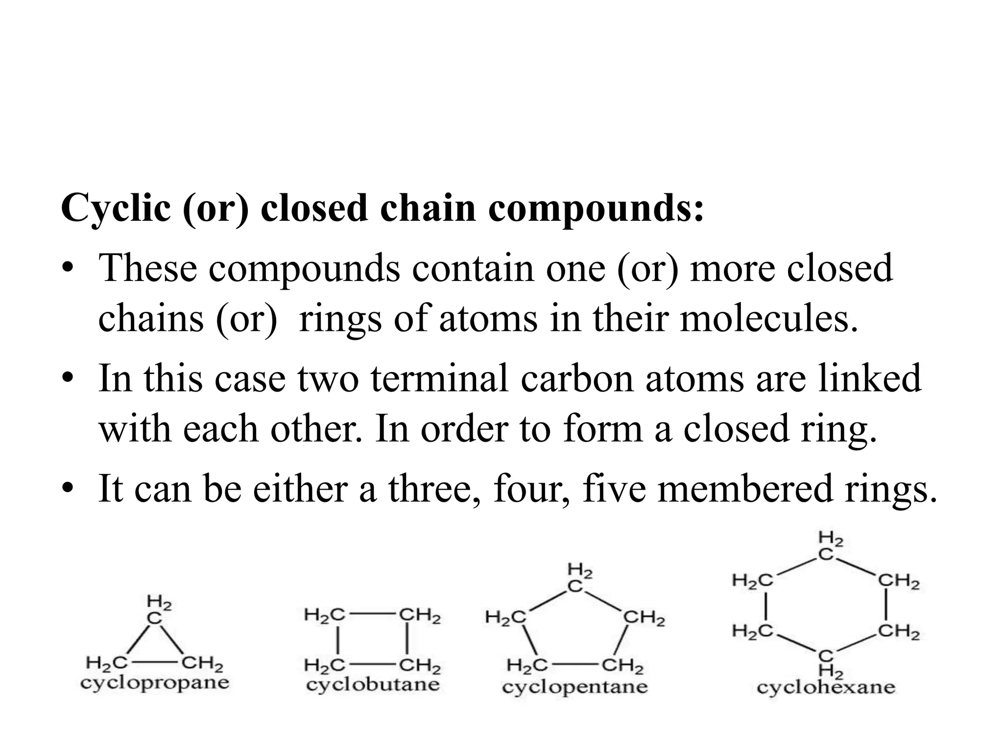 Closed chain or cyclic or ring compounds. These compounds contain closed