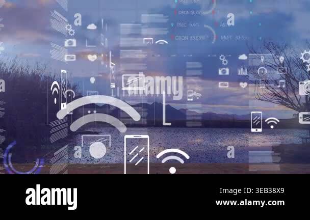 Animation of clouds with electronic devices over landscape. Global ...