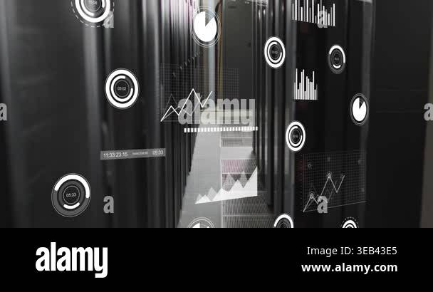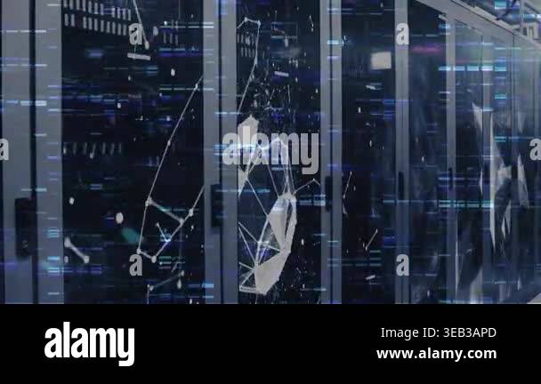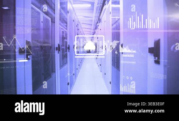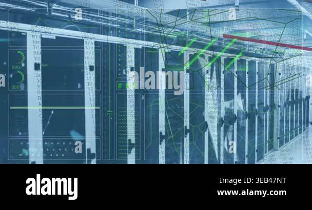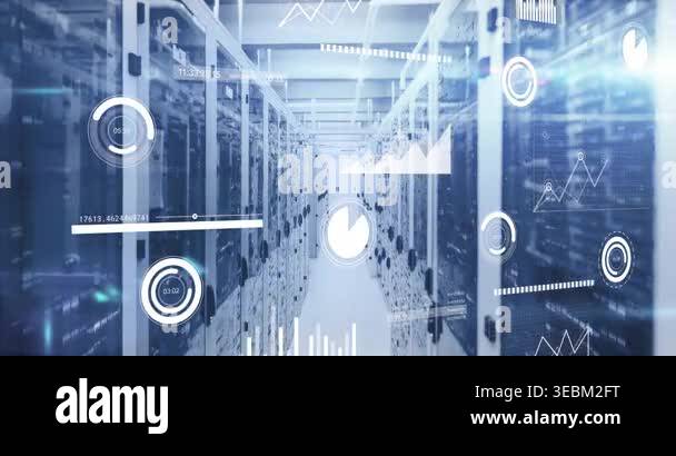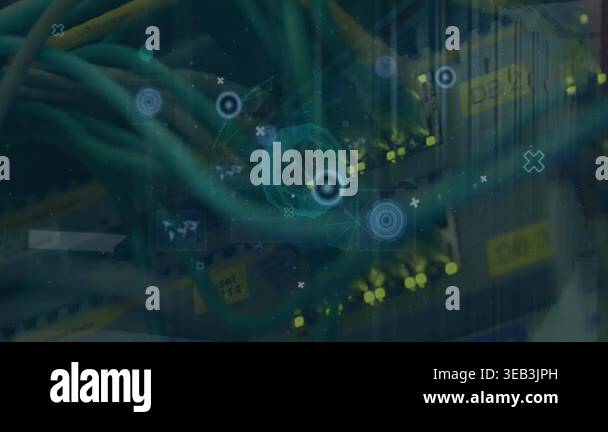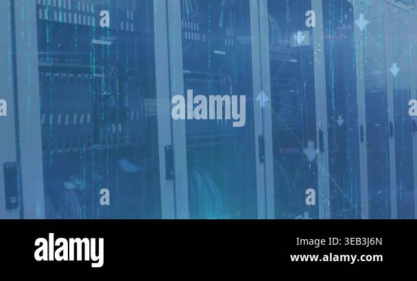 Animation of network of connections with icons over computer servers ...
