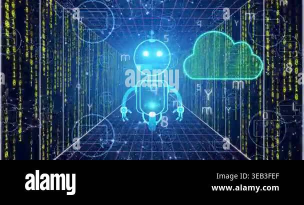 Robot and cloud computing animation over digital data processing ...