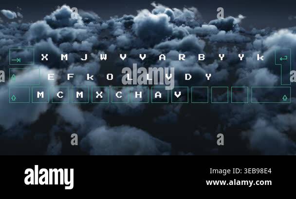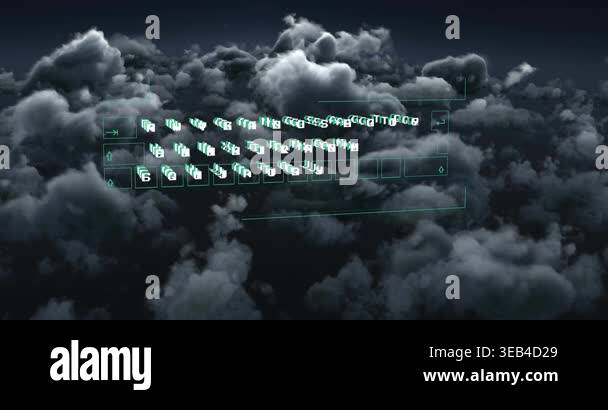 Animation of data processing on computer keyboard over clouds. Global ...