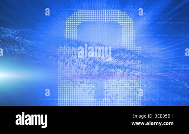 Animation of blue particles moving over lock icon on digital interface ...
