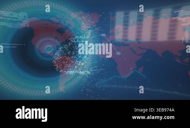 Animation of data processing over world map. Global business, finances ...