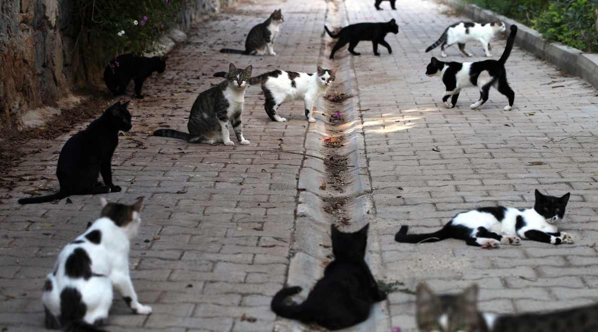 A young female tourists strokes a clowder of feral cats in the town of ...