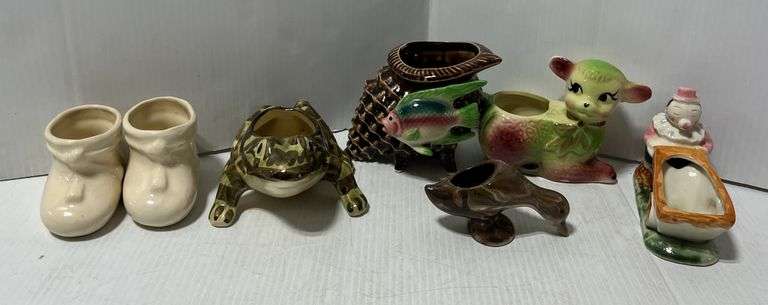 Porcelain items, include: Duck, clown, shell, frog, boots, and Japan ...