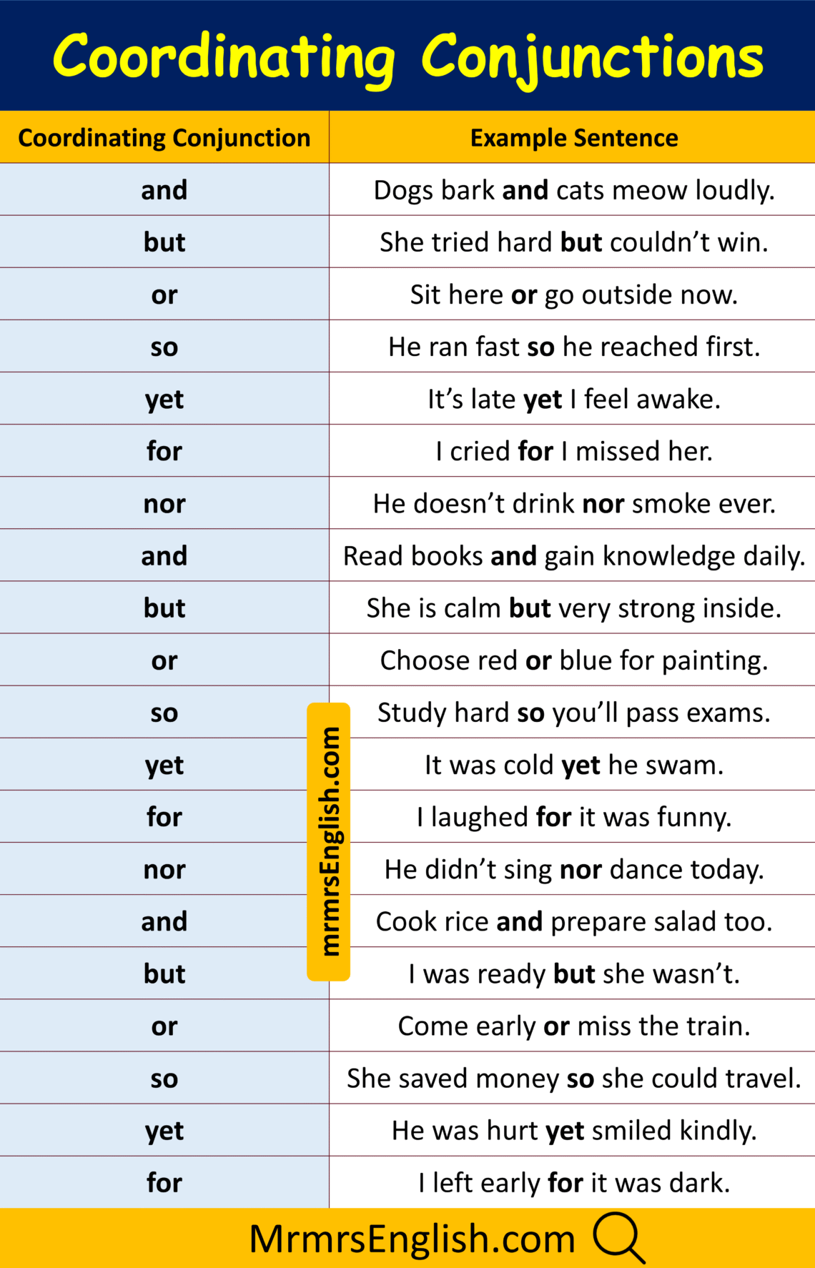 100 Coordinating Conjunctions Examples Sentences in English - MR MRS ...