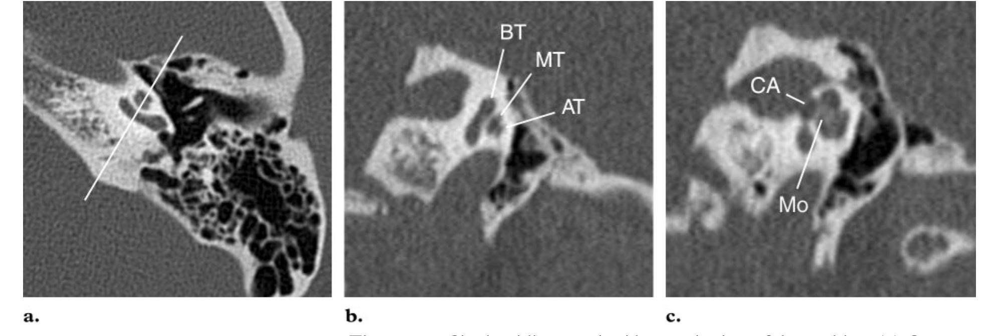 Single-oblique sagittal long-axis view of the cochlea. (a)