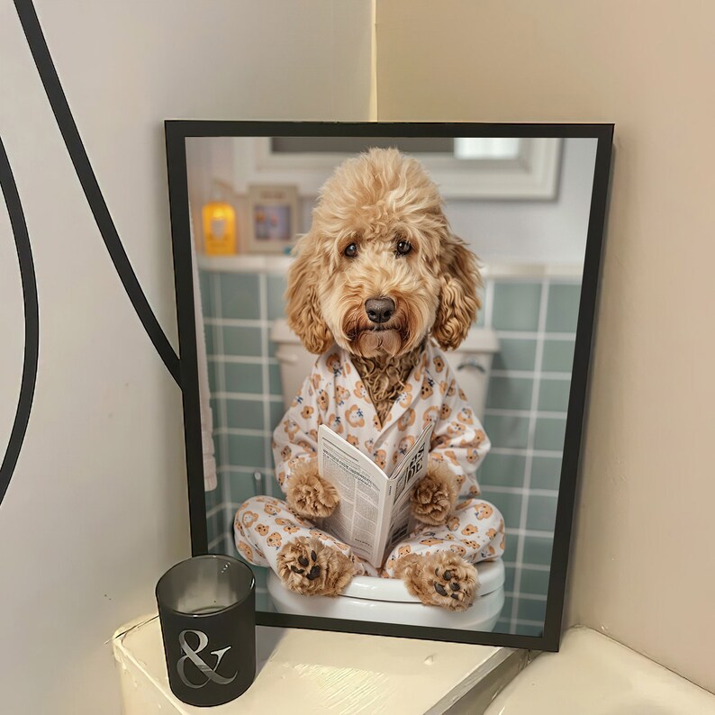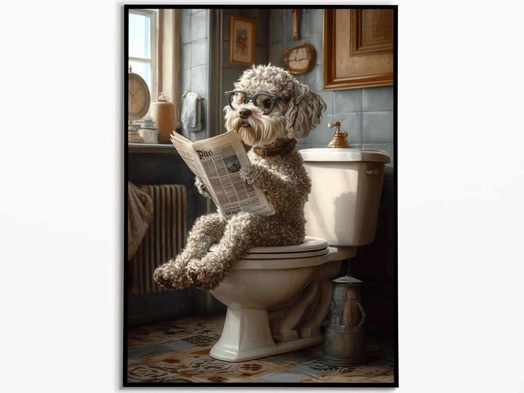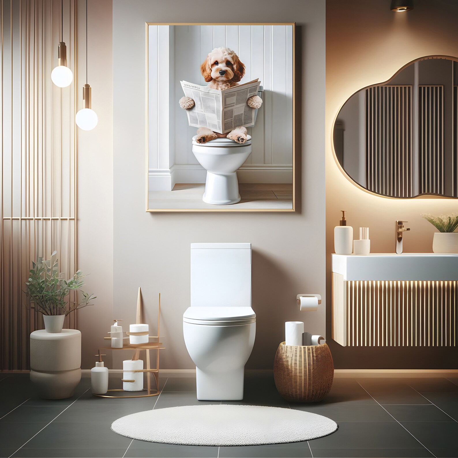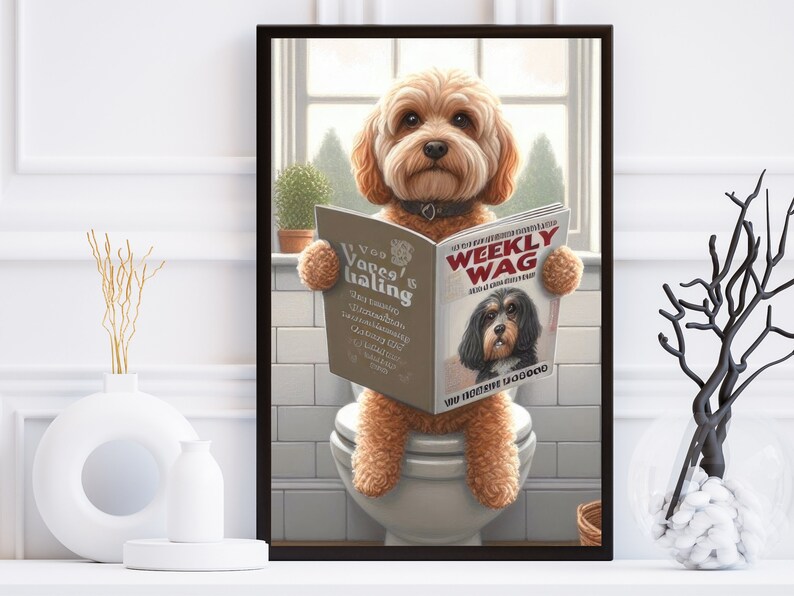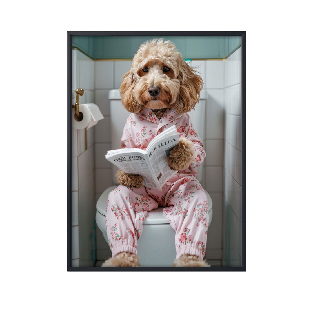 Cockapoo Dog on the Toilet Reading Newspaper, Funny Bathroom Art ...
