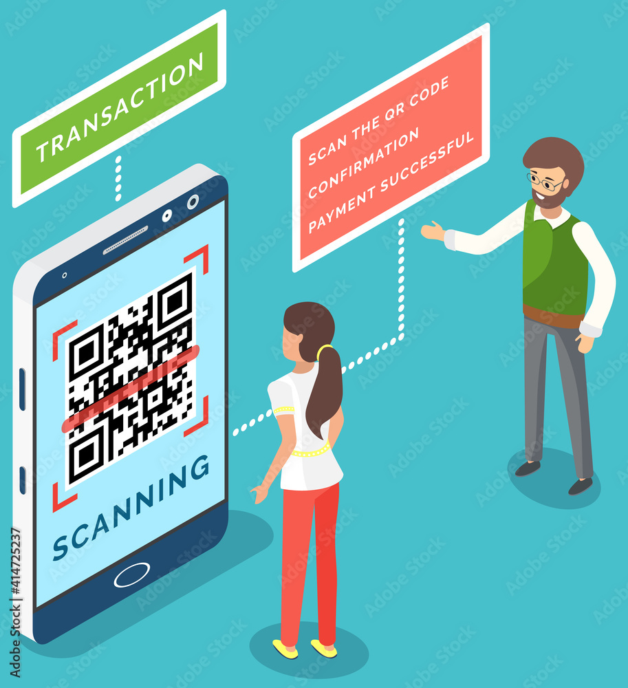Woman and man scanning qr code via mobile phone scanner device ...