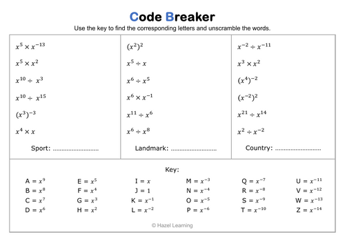Laws of Indices (Three Basic Rules) Code Breaker by Hazel Learning