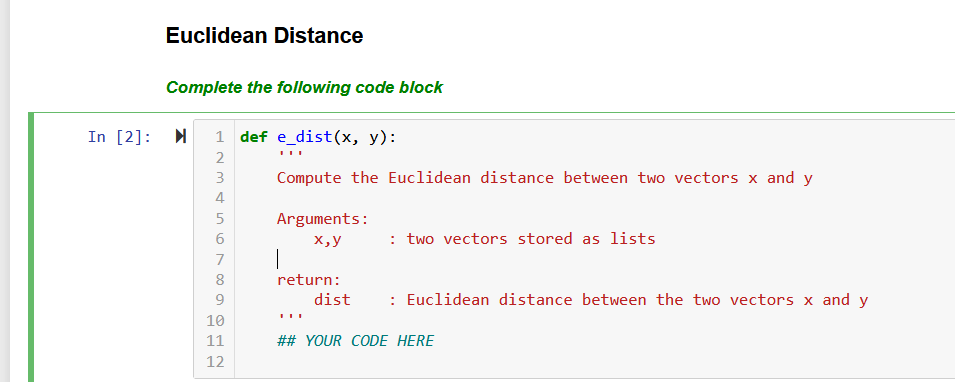 Solved Euclidean Distance Complete the following code block | Chegg.com