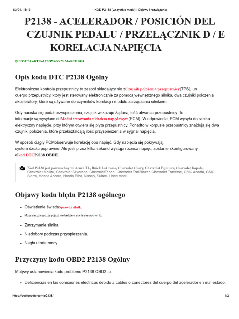 KOD P2138 (Wszystkie Marki) - Objawy I Rozwiązania | PDF