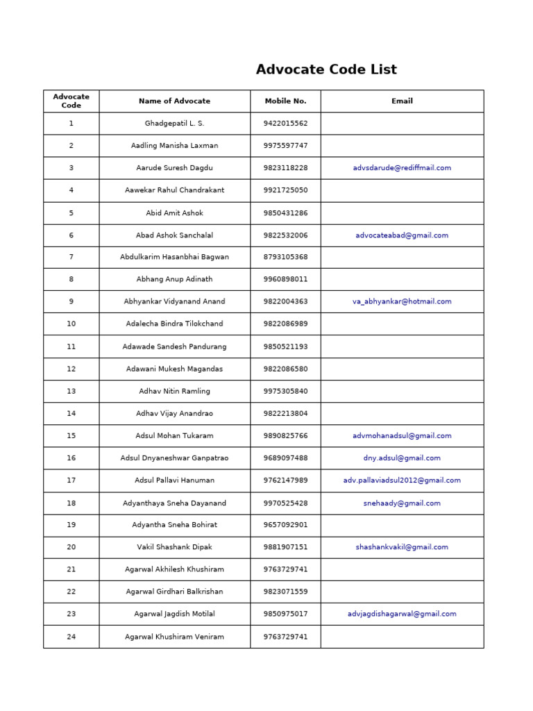 Advocate Code List: Advocate Code Name of Advocate Mobile No. Email | PDF