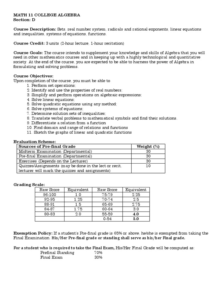 MATH 11 Course Guide and Policies | PDF | Equations | Quadratic Equation