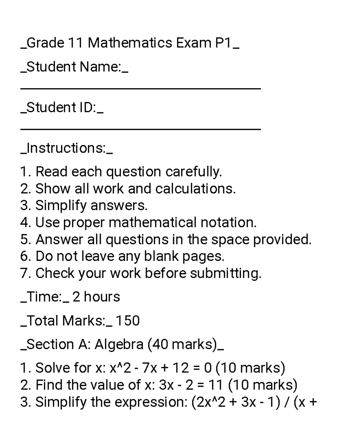 Grade 11 Mathematics Exam P1 (Math 223) - Instructions & Sections - Studocu