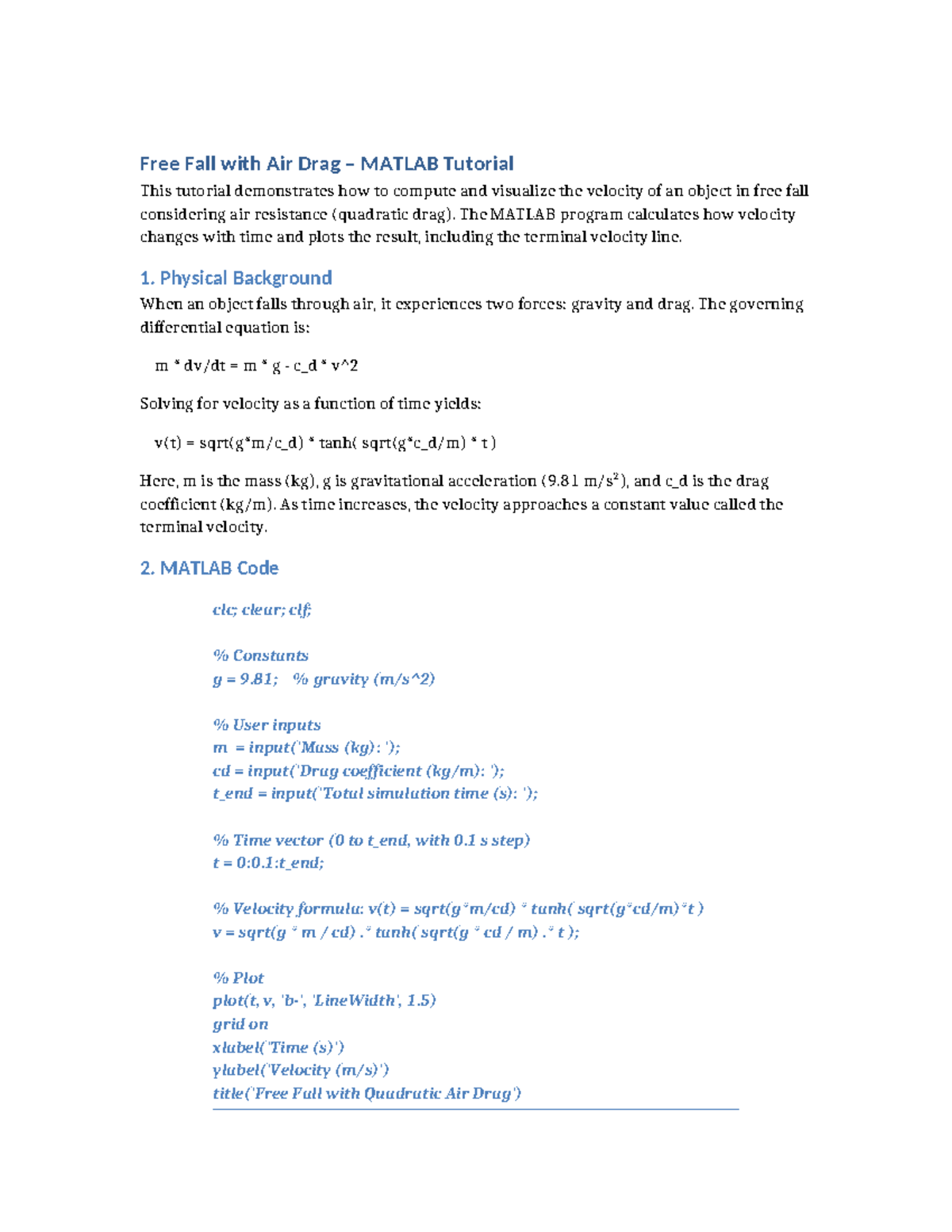 Free Fall with Air Drag: MATLAB Tutorial & Code Analysis - Studocu