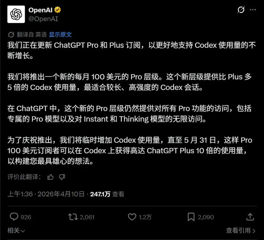 OpenAI上新100刀套餐,Codex重度用户有福了