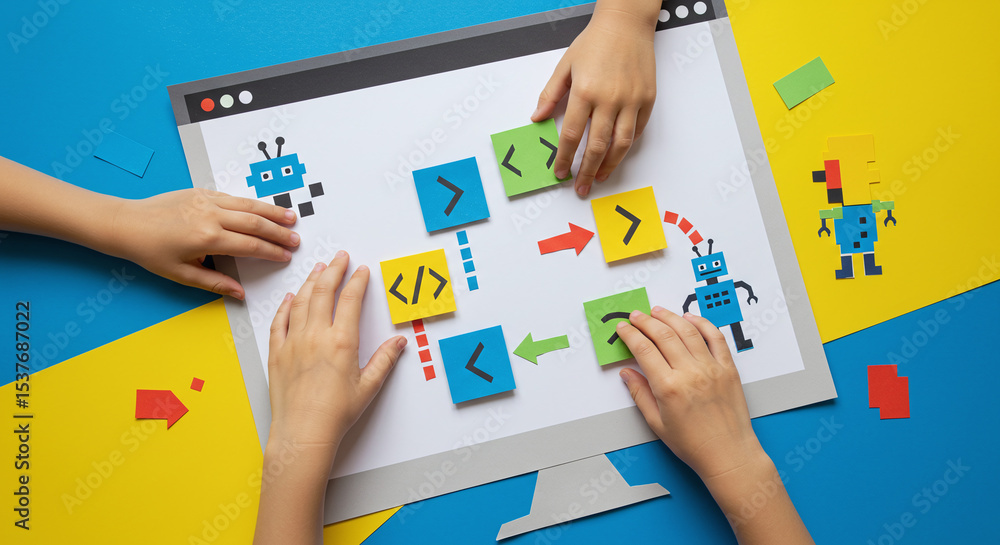 Young Hands Exploring Coding Block Programming with Robots Stock Photo ...