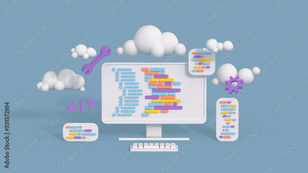 Minimal desktop with coding symbols and programming windows 3D ...