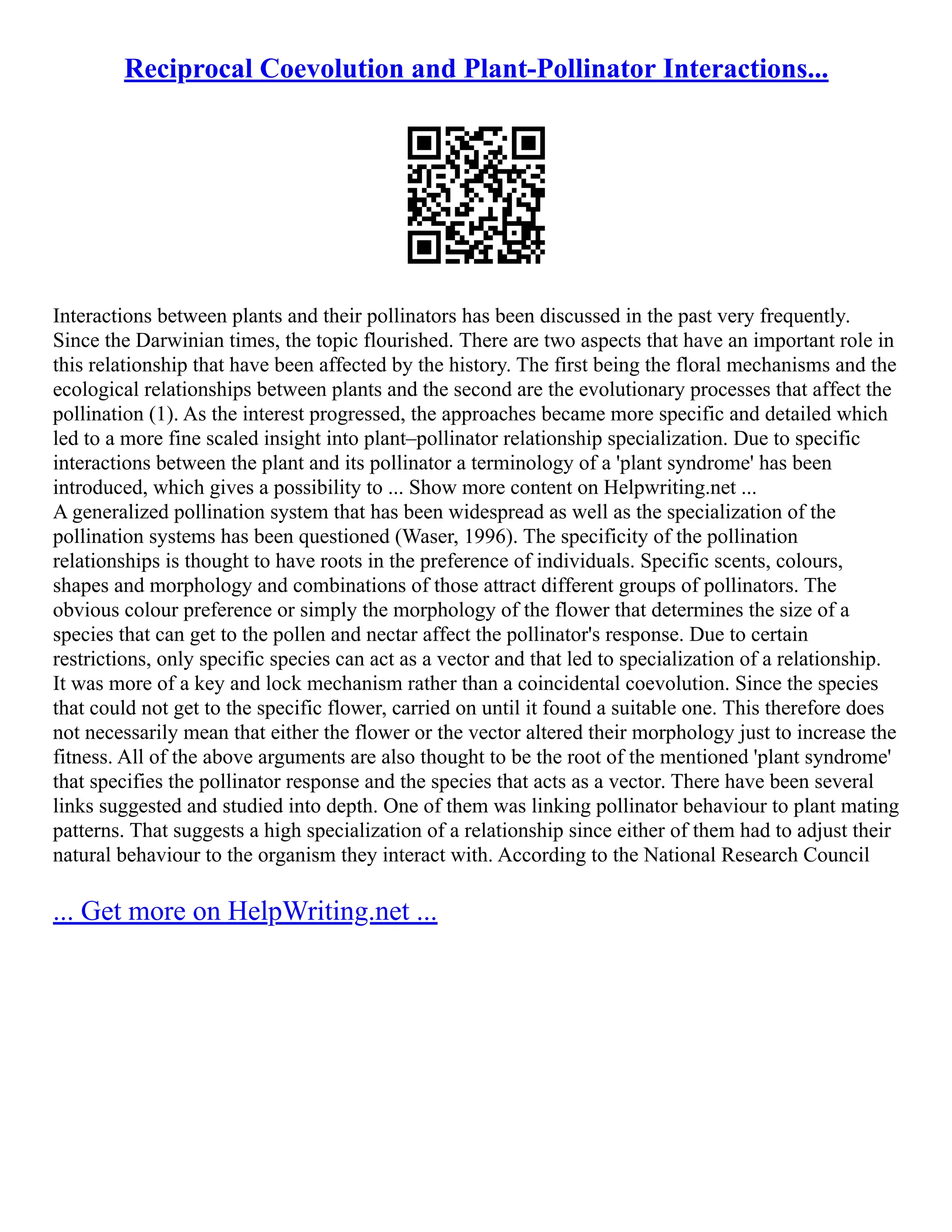 Reciprocal Coevolution And Plant-Pollinator Interactions... | PDF