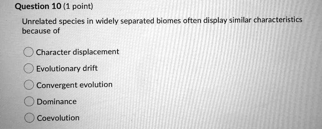 Question 10 (1 point) Unrelated species in widely separated biomes ...