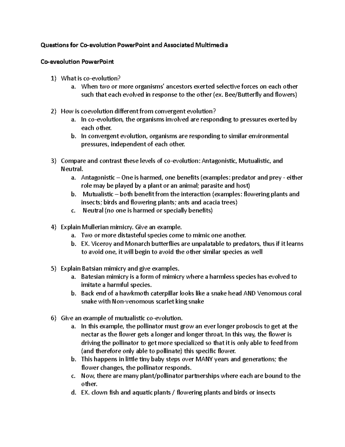 (2) Questions for Coevolution - When two or more organisms’ ancestors ...