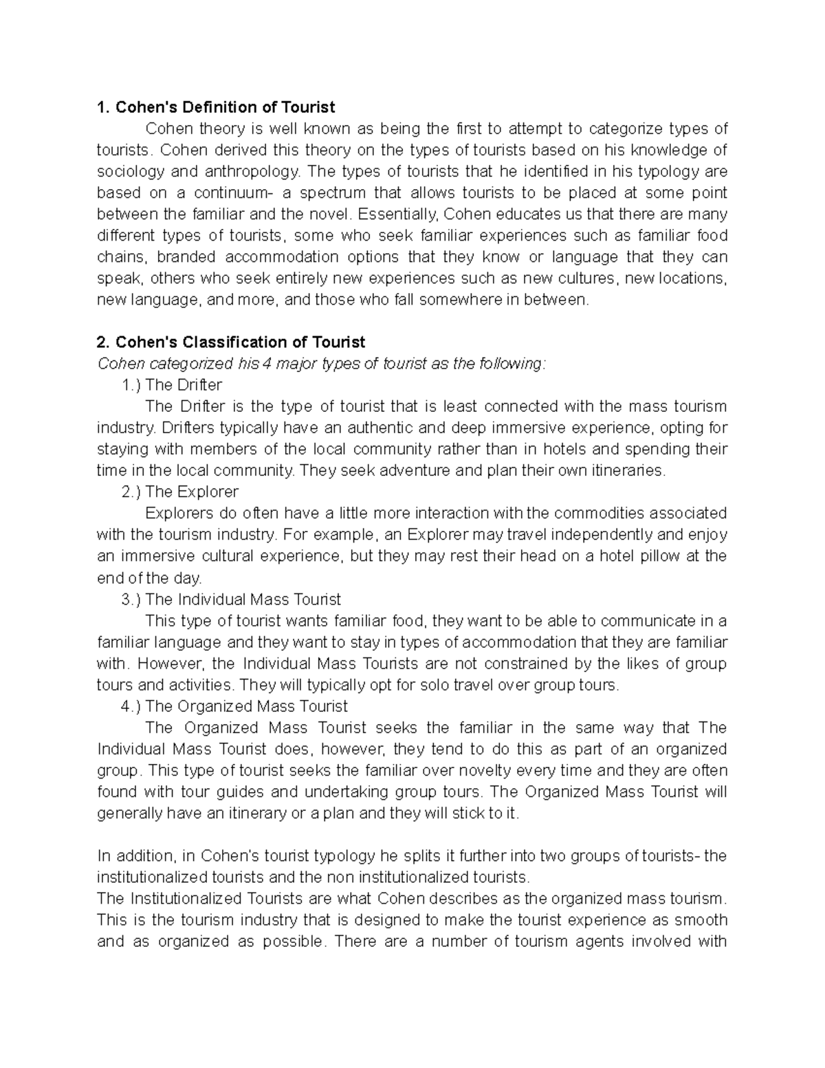 Understanding Cohen's Classification of Tourists: Exploring | Course Hero