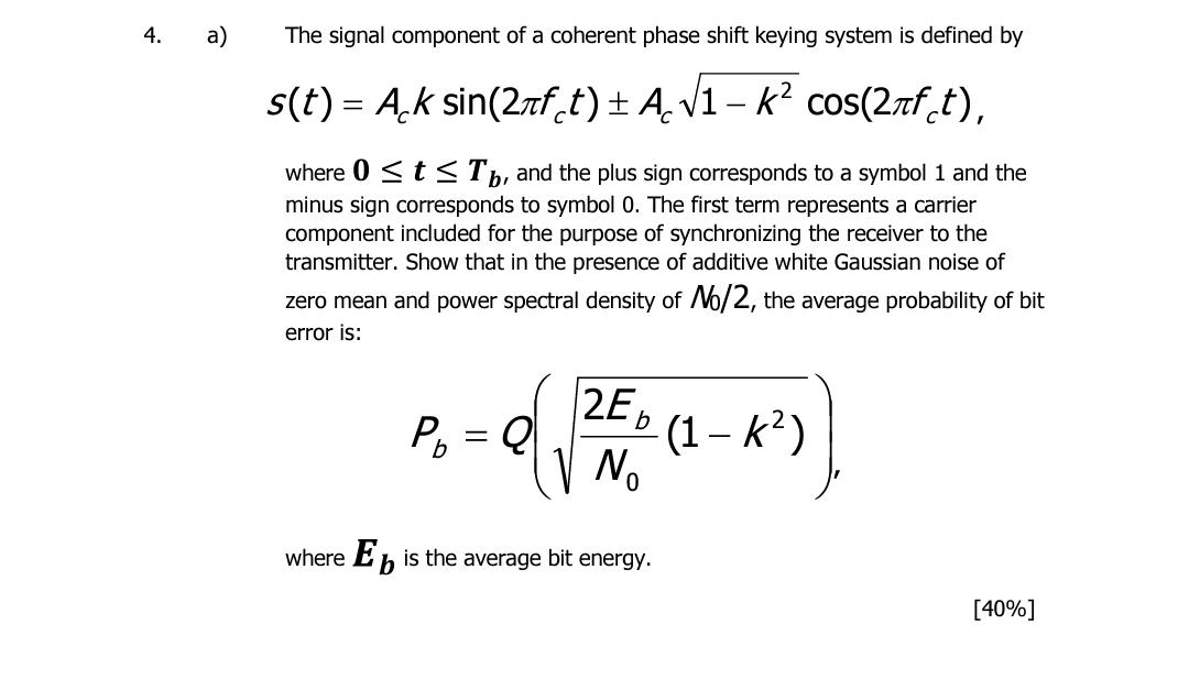 Solved 2. (20%) The signal component of a coherent PSK | Chegg.com