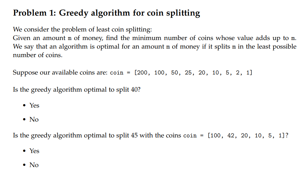 Solved Problem 1: Greedy algorithm for coin splitting We | Chegg.com