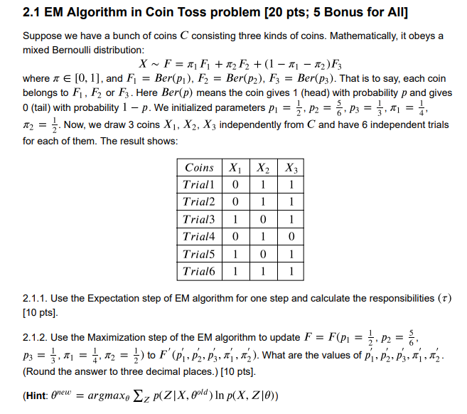 2.1 EM Algorithm in Coin Toss problem (20 pts; 5 | Chegg.com