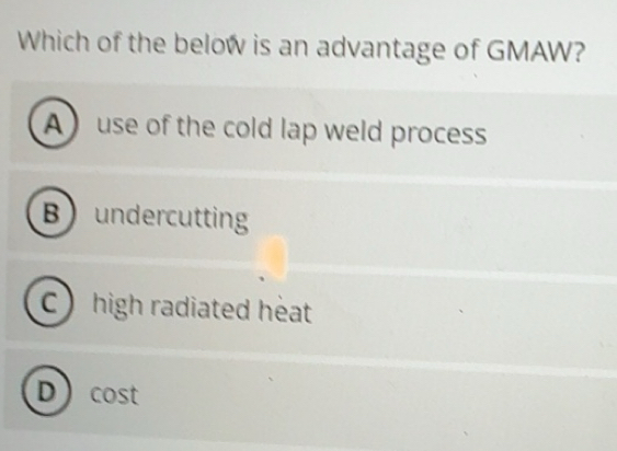 Solved: Which of the below is an advantage of GMAW? Ause of the cold ...