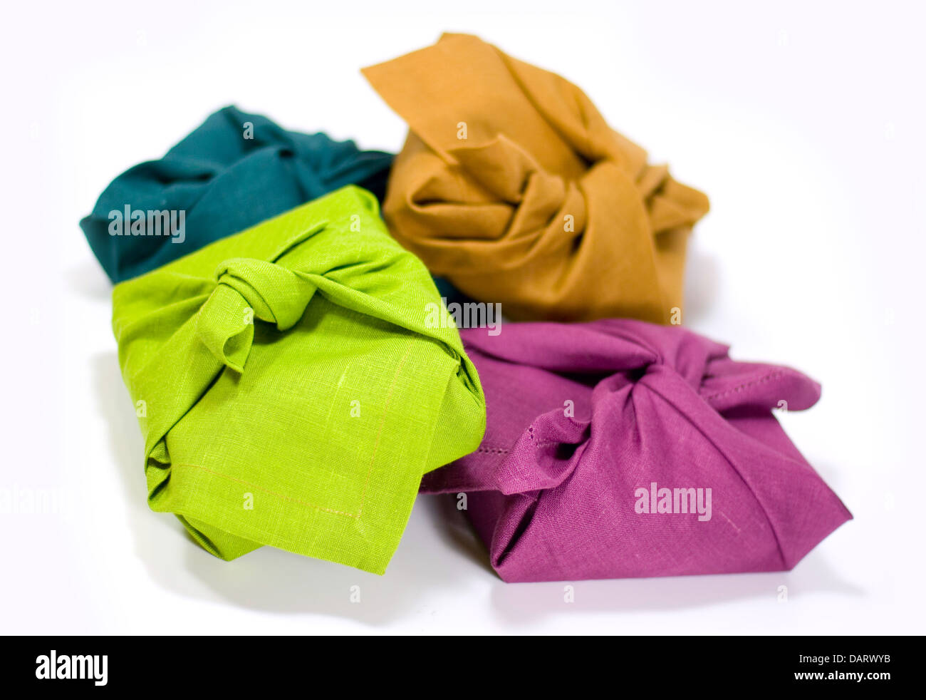 A pile of colorful boxes with a purple ribbon around the bottom ...