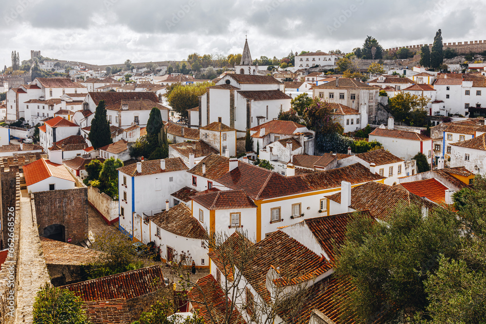 Skyline as it seen from castle walls in UNESCO heritage town of Óbidos ...