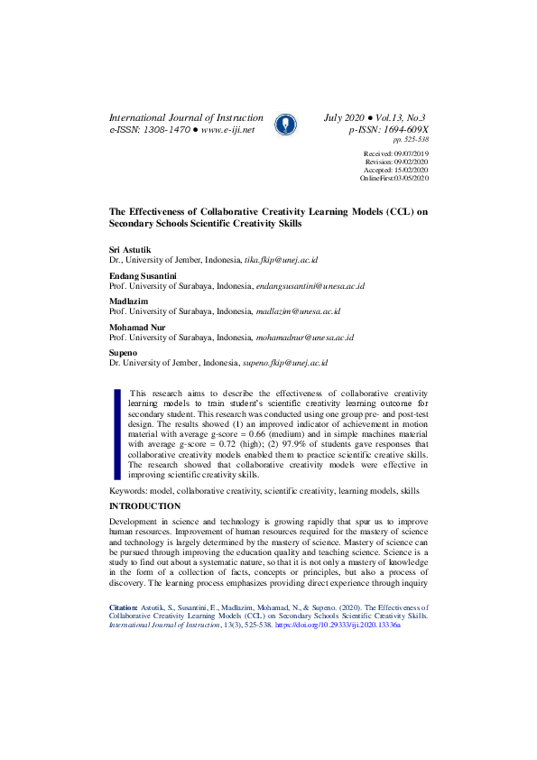 (PDF) The Effectiveness of Collaborative Creativity Learning Models ...