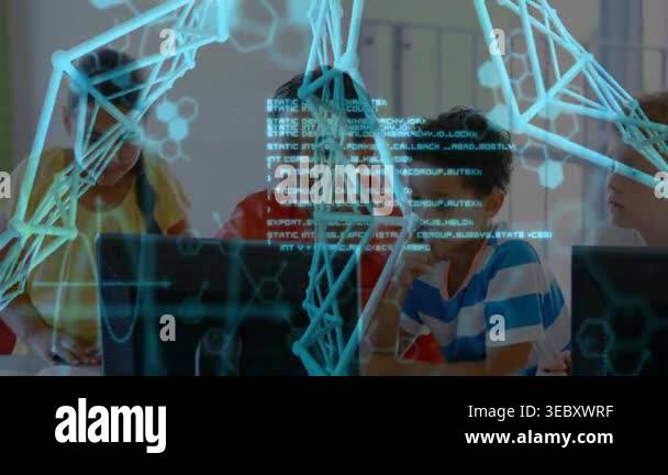 Six kids leaning in class, lead child tapping tablet, neon-pink network ...