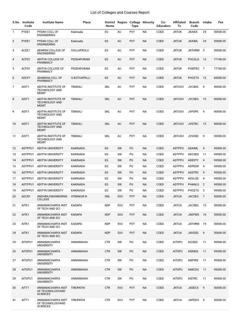 List of Colleges and Courses Report | PDF