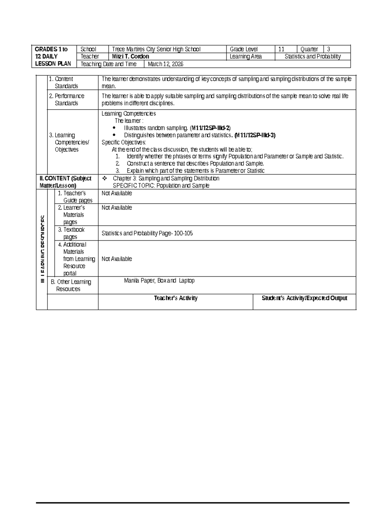 Statistics and Probability Lesson Plan for Grades 1-12 (Q3) - Studocu