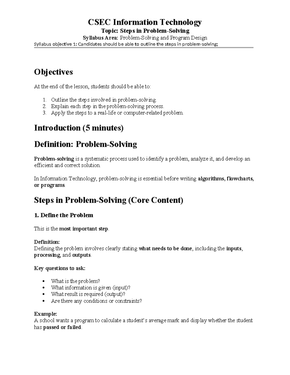CSEC IT: Steps in Program Design - Objective 1 Study Guide - Studocu