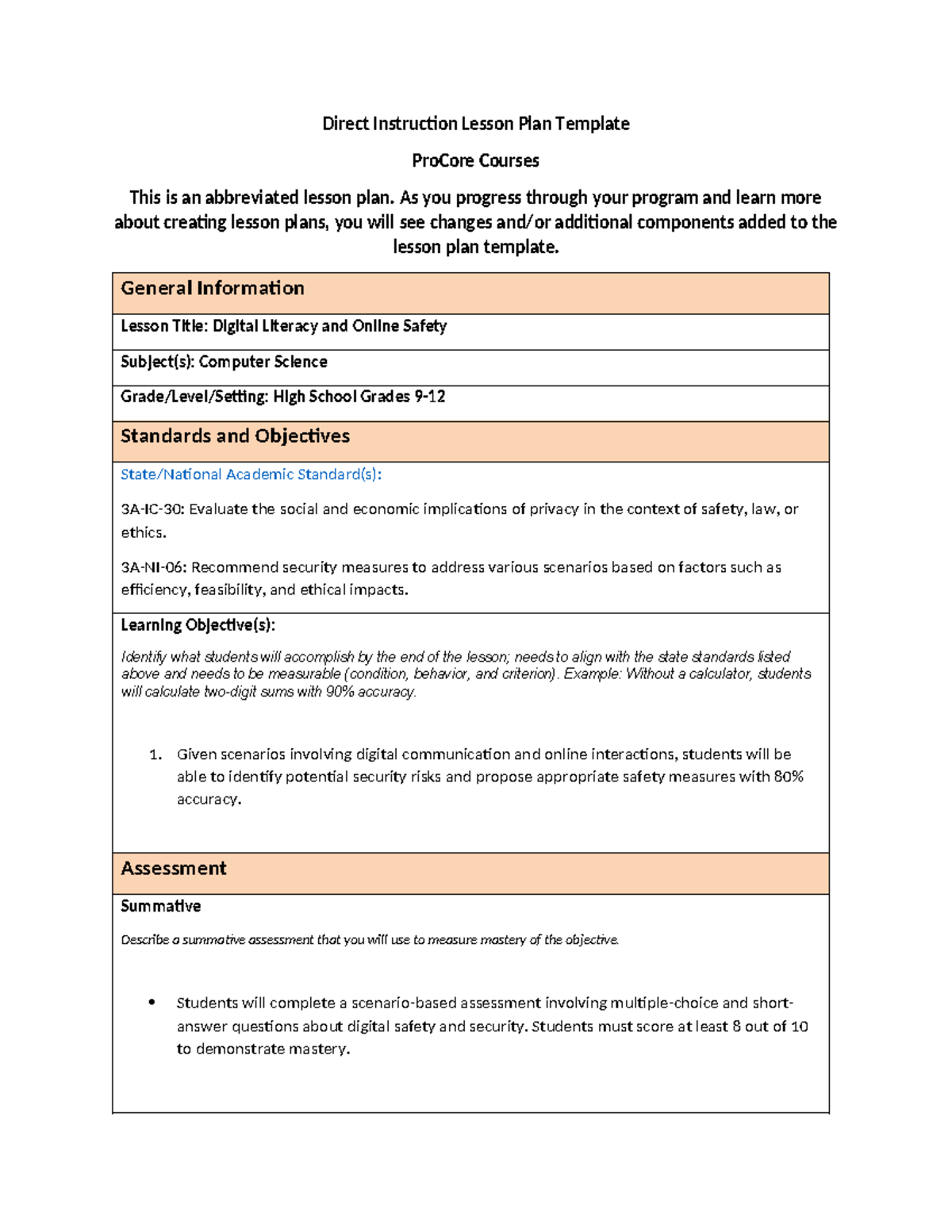 Digital Literacy & Online Safety Lesson Plan Template (ProCore) - Studocu