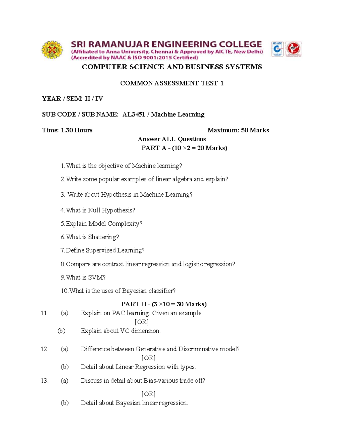 CAT - 1 AL3451 Machine Learning Common Assessment Questions - Studocu