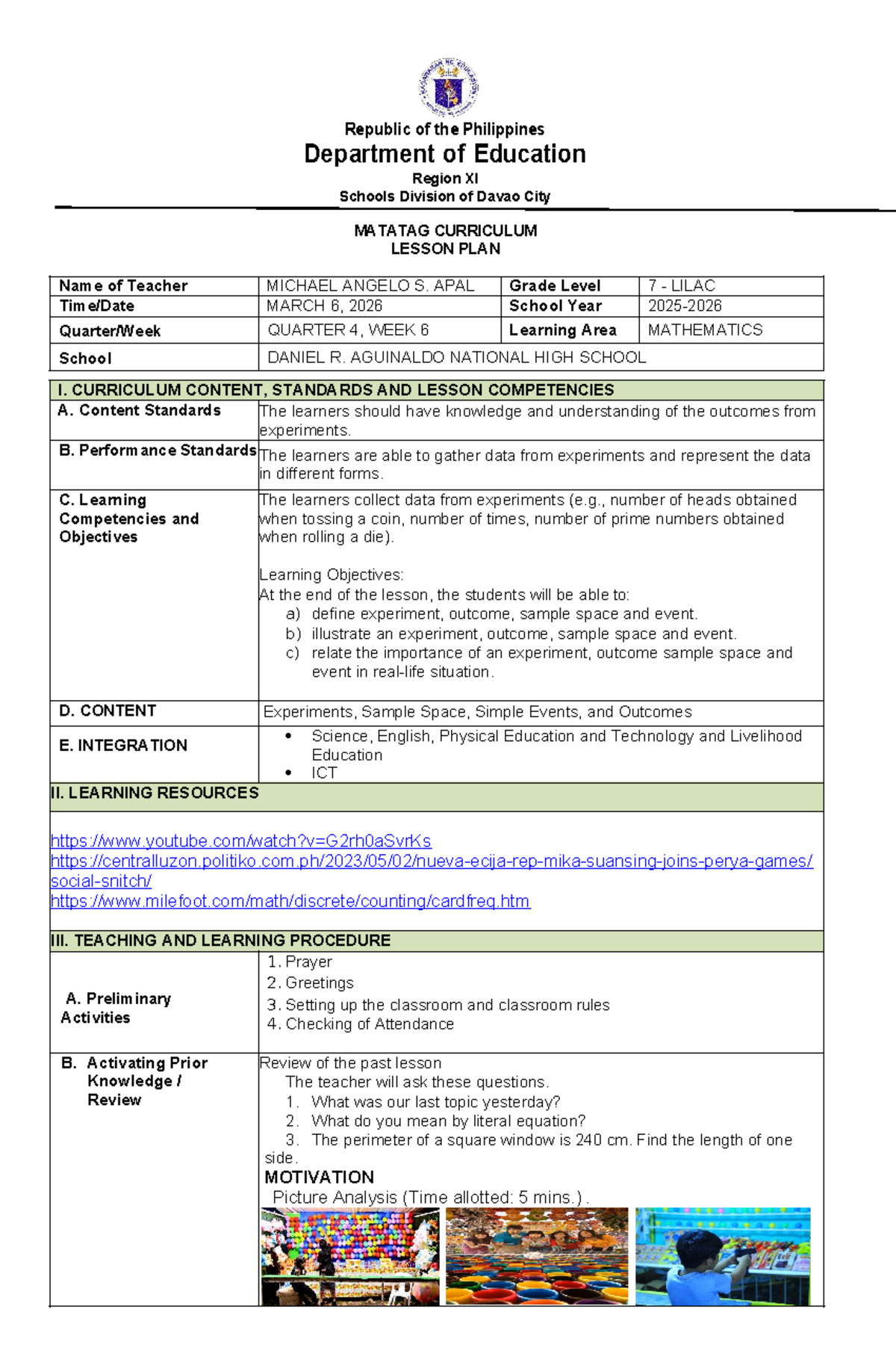 MATATAG CURRICULUM LESSON PLAN: Math 7 - Experiments & Outcomes - Studocu