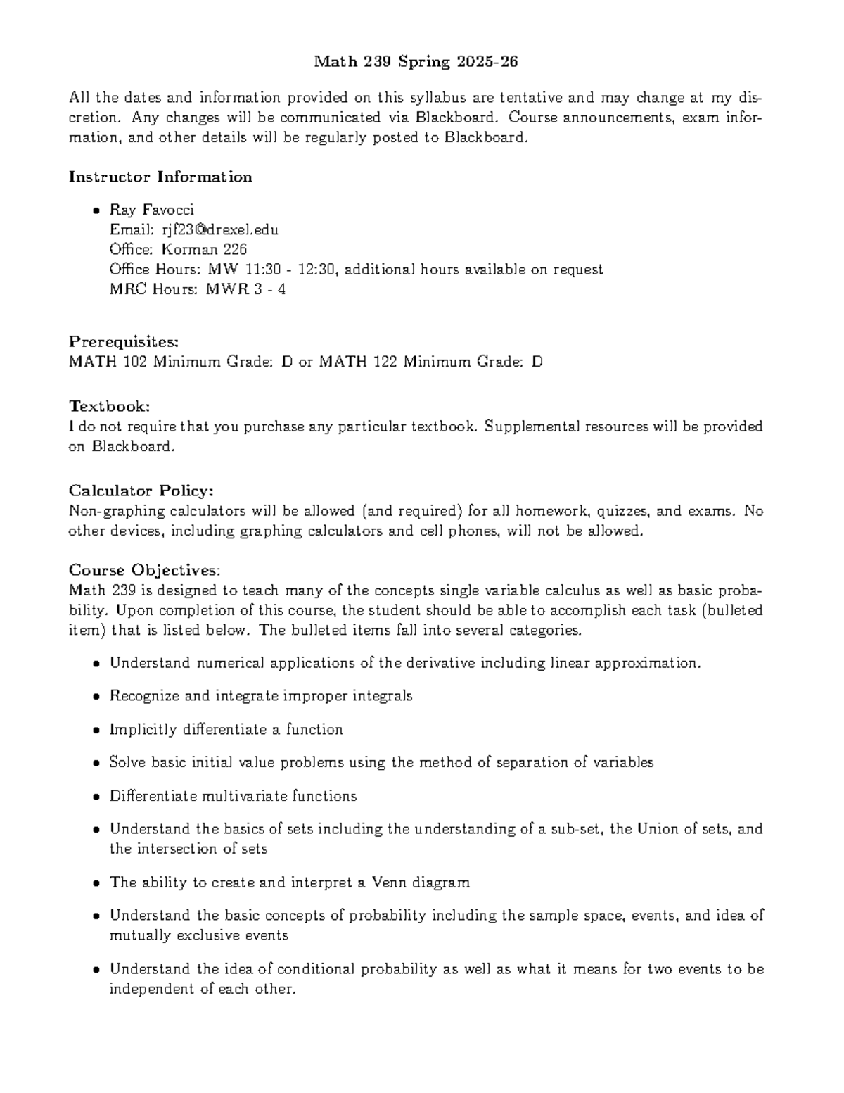 Math 239 Spring Syllabus: Course Info & Objectives - Studocu