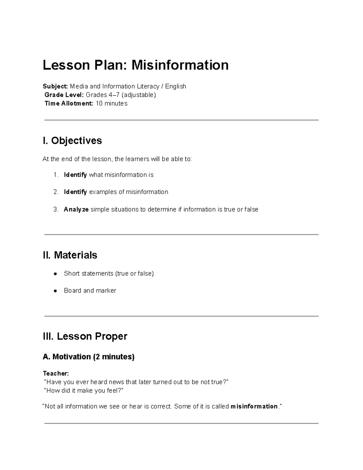 Lesson Plan: Misinformation in Media & Info Literacy - Studocu