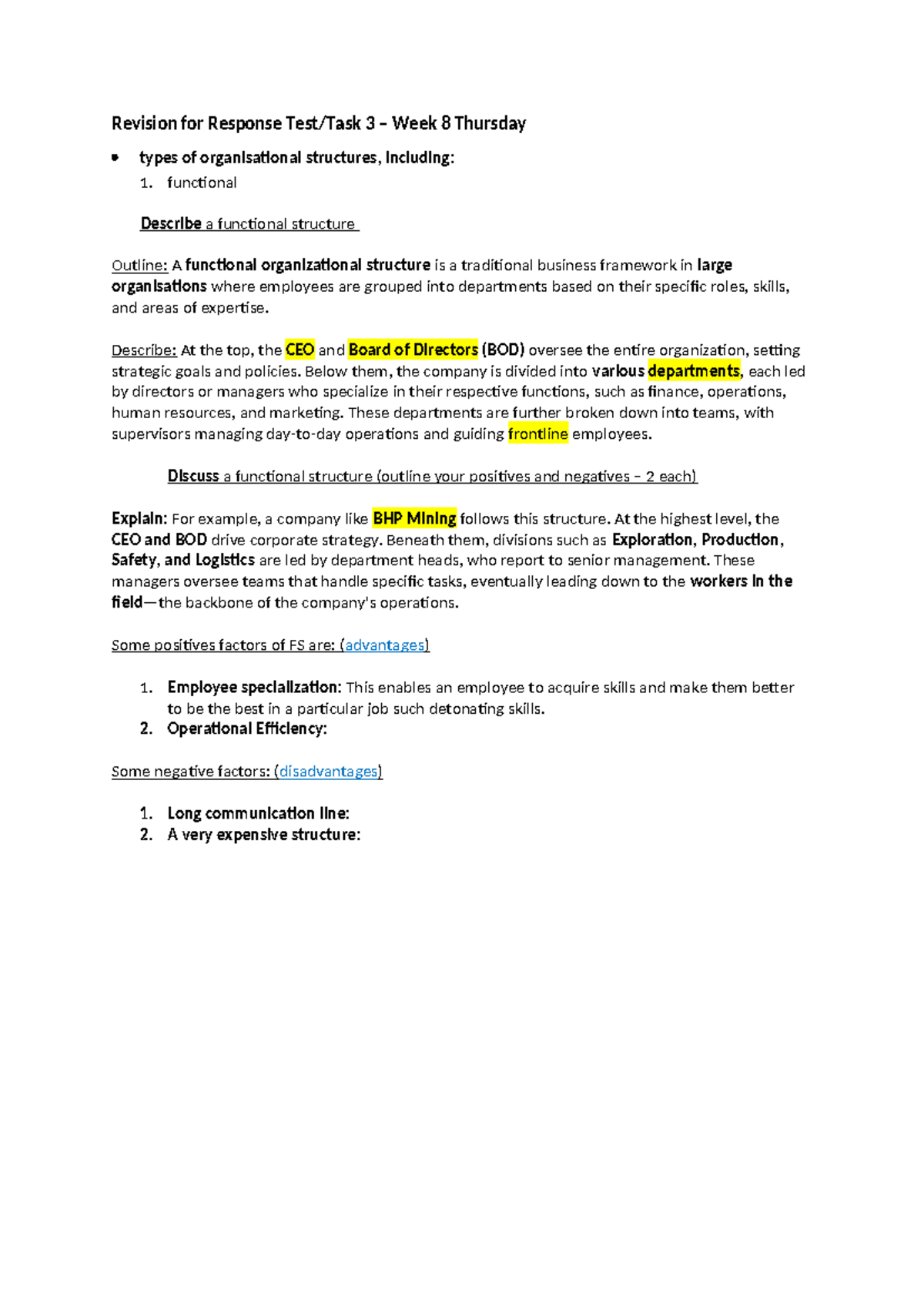 Revision for Response Test in Week 9: Org Structures & Management - Studocu