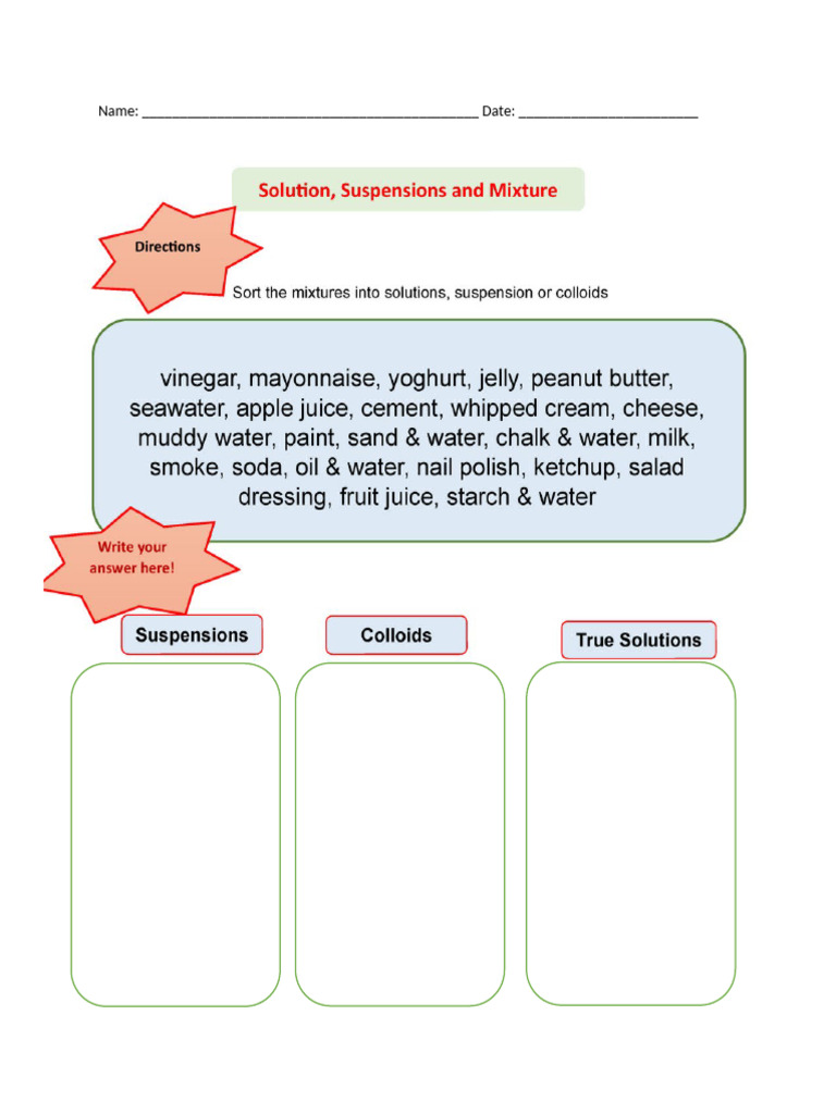 Solution, Suspension, Colloids Activity | PDF | Spoon | Suspension ...