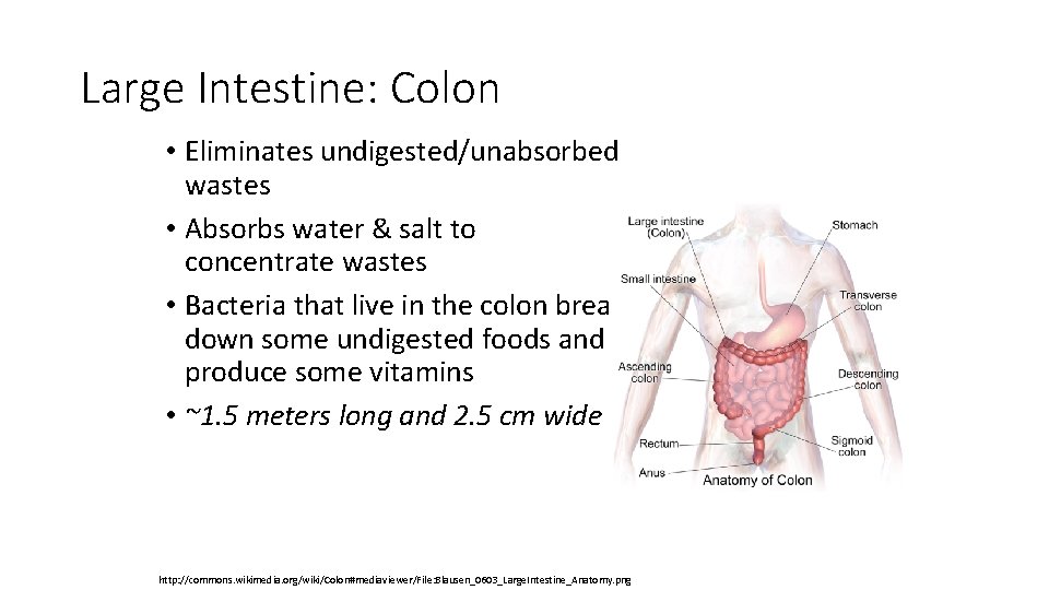 Large Intestine Colon Eliminates undigestedunabsorbed wastes Absorbs water
