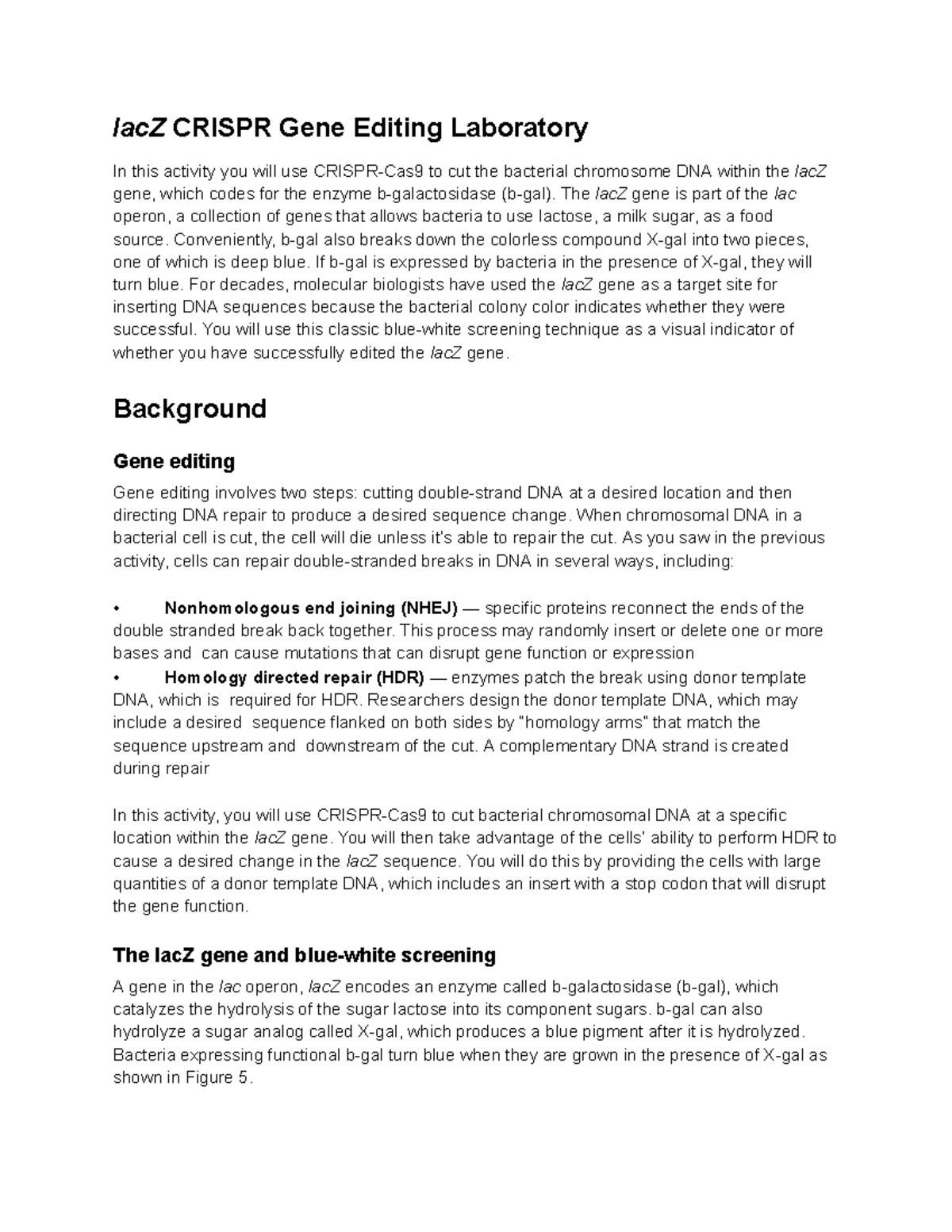 CRISPR Gene Editing Lab: lacZ Gene Analysis (Course Code: 9997826 ...
