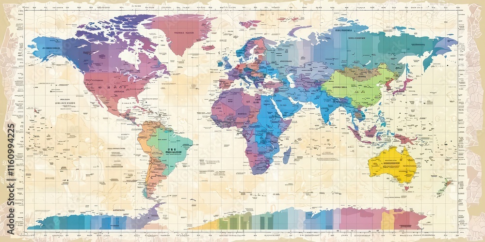 A detailed world map showing time zones, with clear color coding for ...
