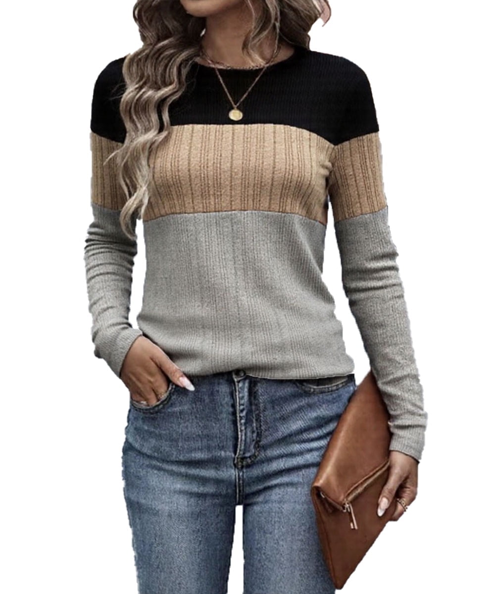 NJWS Women Striped Color Block Knit Sweater Long Sleeve Crew Neck Slim ...