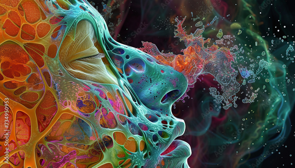 An abstract artistic interpretation of a 3D CTMRI scan with vibrant ...